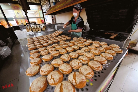 从博物馆出来,记者团来到太谷百年老店“鑫炳记”。刚到门口,扑鼻而来阵阵香气,工作人员介绍:“这是太谷饼,都是纯手工制作,而且不添加任何防腐剂,因配方独特,太谷饼久储不坏,口感绵软。”记者团来到跟前,看到制饼师傅娴熟烤制的面饼,入炉前的太谷饼色泽莹润,烘烤后微微张开的裂纹散发着酥软香甜的滋味,咬上一口,香、酥、绵、软,入口即化,真是人间美味。