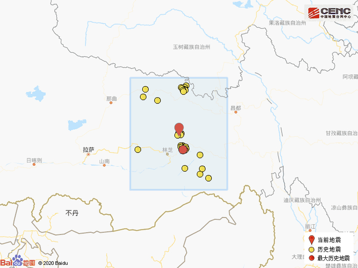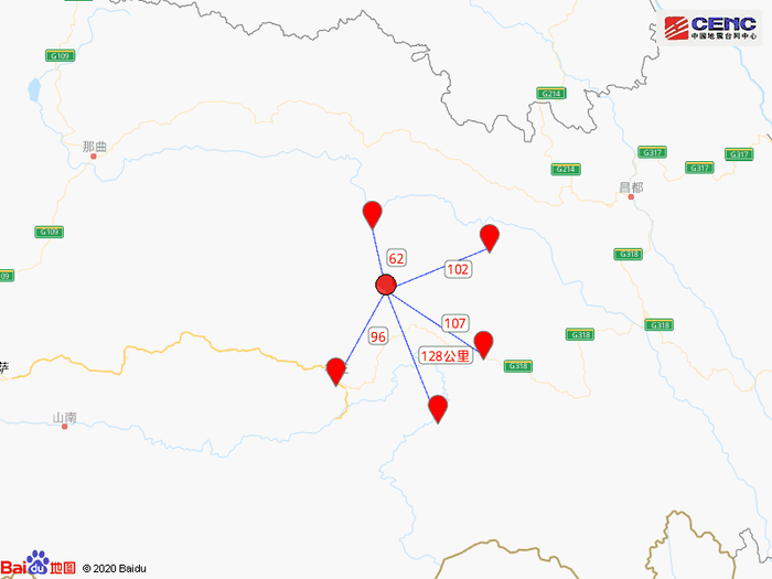 周边县城:震中距边坝县62公里、距巴宜区96公里、距洛隆县102公里、距波密县107公里、距墨脱县128公里,距林芝市95公里,距拉萨市368公里。