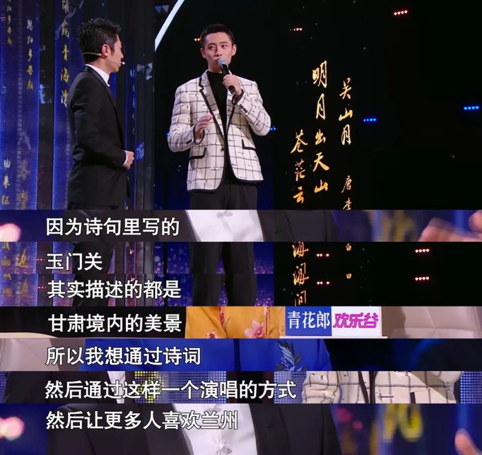 当晚,首次登上《经典咏流传》舞台的兰州歌手魏晨用一曲《关山月》作为自己对家乡的献礼赞歌。当撒贝宁问其为何选择《关山月》唱给大家时,魏晨率性地说:“诗词里的玉门关是甘肃的美景,我想通过演唱的方式,让更多人了解甘肃、喜欢甘肃。”舞台上谈起家乡甘肃,魏晨作为兰州人的自豪之情溢于言表。他希望通过自己的传唱,刷新人们心中对甘肃的固有印象,也由衷地欢迎人们去饱览甘肃山水、品味甘肃美食。