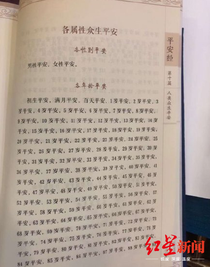 如“各性别平安”一题下,是“男性平安,女性平安”;在“各年龄平安”一题下,是“初生平安,满月平安,百天平安,1岁平安……”直至那一页末尾的“89岁平安”等等。除此之外,还有“中国公共场所平安”,将中国主要的一些火车站和港口都加上了“平安”后缀;以及“人类众生平安”和“众生身心平安”等,分为身心平安、感觉平安、呼吸系统平安、消化系统平安、神经系统平安等。许多网友将其称为“奇书”。