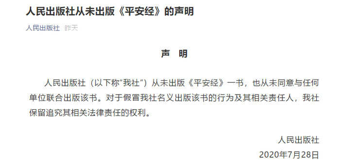 虽然网友晒出的《平安经》封面上显示出版单位是人民出版社和群众出版社,但7月28日下午,人民出版社已经在其官方微博发布声明称:人民出版社从未出版《平安经》一书,也从未同意与任何单位联合出版该书。对于假冒我社名义出版该书的行为及其相关责任人,我社保留追究其相关法律责任的权利。