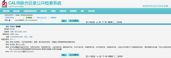 CALIS的检索页面显示,该书主题为“社会治安综合治理”。附注中称,该书内容“囊括宇宙时空平安、世界大地平安、世界各界平安、人类文明平安、国家地区平安、中华大地平安、中华各界平安、中华文明平安、中国各地平安、人类众生平安等十个方面的知识体系。意在建构平安之最、平安大全的共同体平台,让公众在仪式感和敬畏感中形成平安意识,营造平安氛围,汇聚平安能量”。