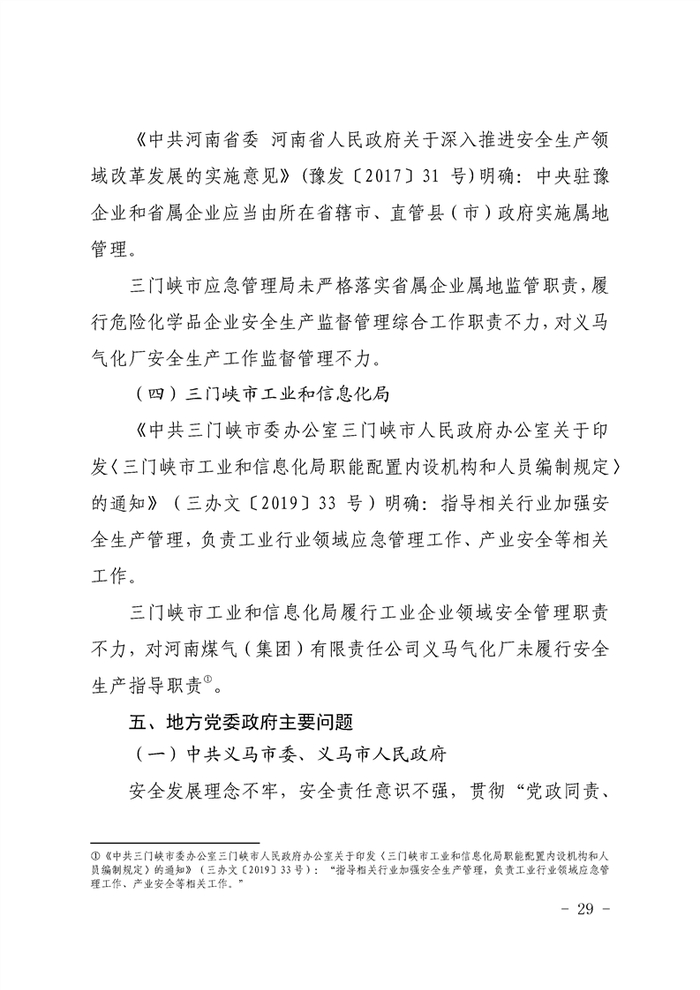 相关政府职能部门落实省属企业属地监管职责、履行危险化学品企业安全生产监督管理综合工作职责不力,对义马气化厂安全生产工作监督管理不到位;履行工业企业领城安全管理职责不力,对河南煤气(集团)有限责任公司义马气化厂未履行安全生产指导职责。
