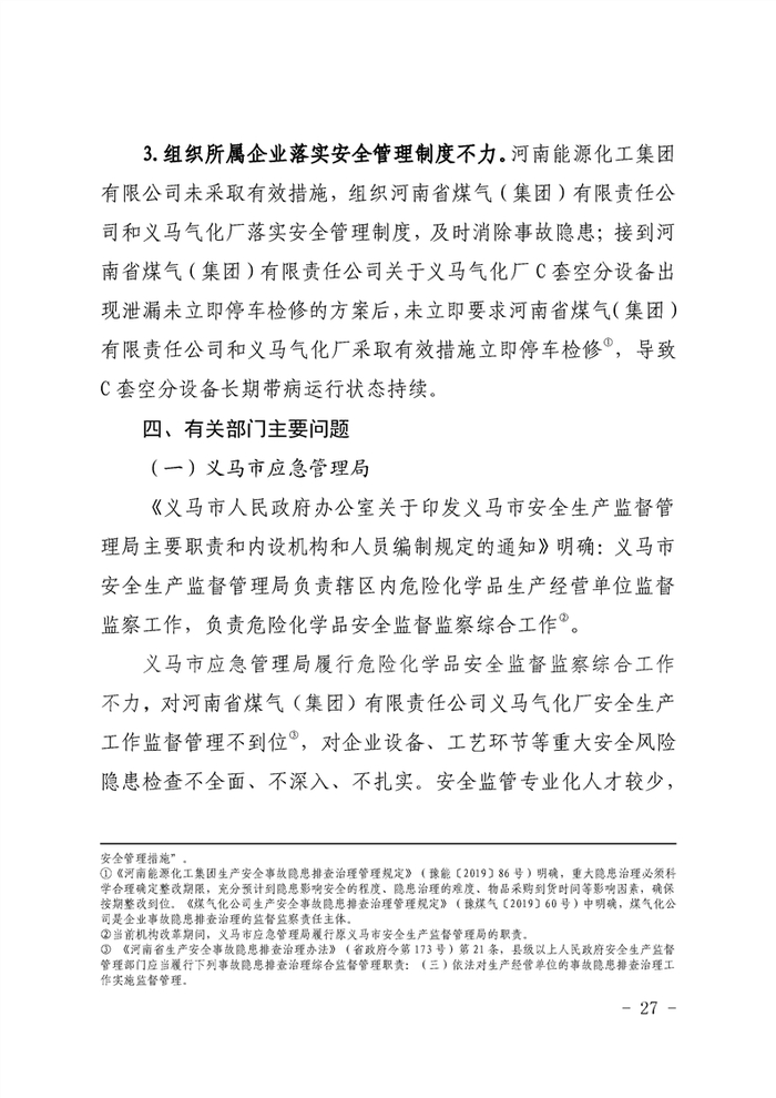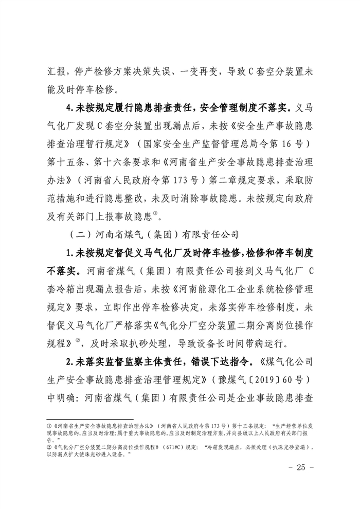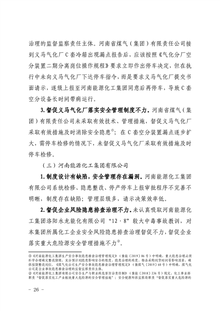 河南省煤气(集团)有限责任公司未按规定督促义马气化厂及时停车检修,检修和停车制度不落实;未落实监督监察主体责任,错误下达指令;督促义马气化厂落实安全管理制度不力。