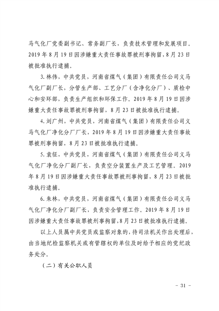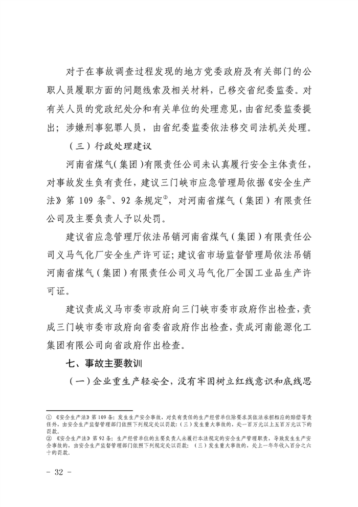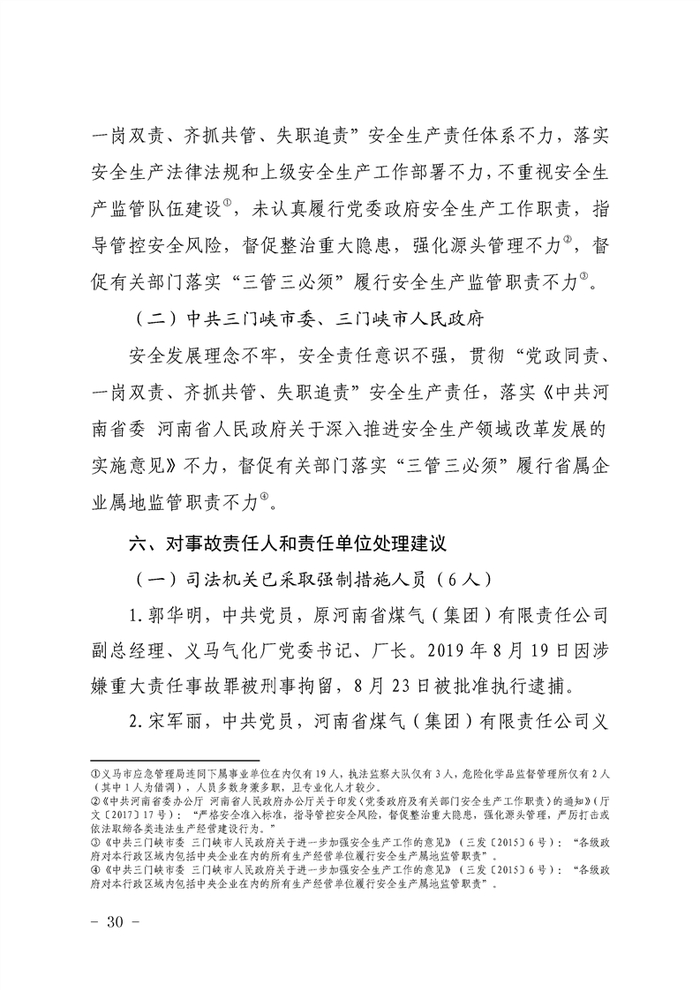 日前,河南省对三门峡市河南煤气(集团)有限责任公司义马气化厂“7·19”重大爆炸事故进行责任追究。6名主要责任人被追究刑事责任,12名政府及部门相关责任人、18名企业责任人员分别被给予党纪政务处分,4个责任单位被责令做出深刻检查,依法对河南省煤气(集团)有限责任公司及其主要负责人予以处罚,依法吊销义马气化厂安全生产许可证和全国工业品生产许可证。