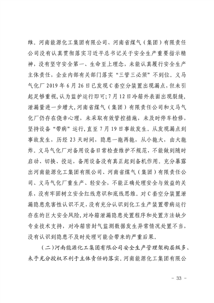 河南能源化工集团有限公司安全发展意识不强;制度建设有重大缺陷,安全管理存在重大漏洞;组织所属企业落实安全管理制度不力。