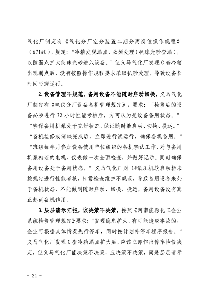 义马气化厂不执行企业技术操作规程,发现隐患没有及时处置;设备管理不规范,备用设备不能随时启动切换;层层请示汇报,该决策不决策;未按规定履行隐患排查责任,安全管理制度不落实。