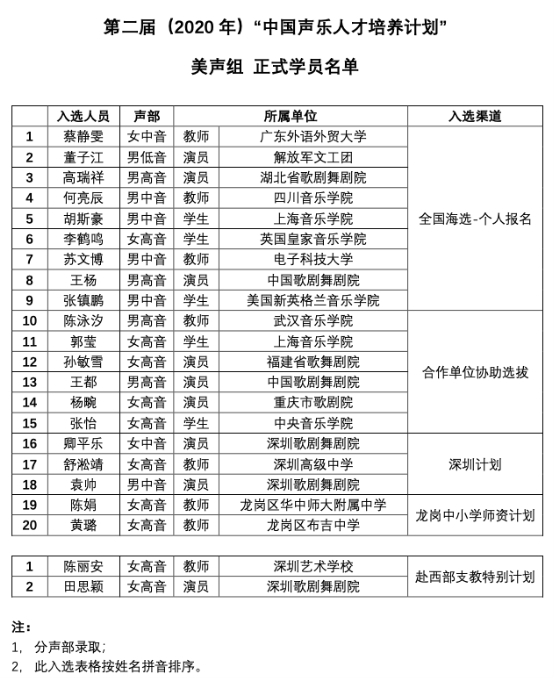 第二届“深圳声乐季·中国声乐人才培养计划”学员名单公布