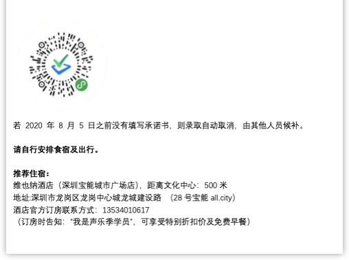 据悉,深圳声乐季组委会于7月21日报名截止后就开始了紧张的海选工作,经过数位权威专家的多轮筛选和综合评定后,最终选定中国声乐组、美声组各20名作为2020年深圳声乐季的正式学员以及2名赴西部支教特别计划学员,另选定全通旁听证学员65名,可旁听大师课、示范课,并观摩全国声乐邀请赛及全国青年歌手展演。