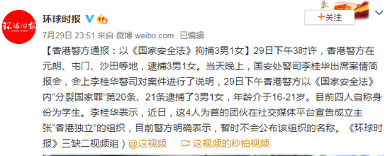 29日下午3时许,香港警方在元朗、屯门、沙田等地,逮捕3男1女。当天晚上,国安处警司李桂华出席案情简报会,会上李桂华警司对案件进行了说明,29日下午香港警方以《国家安全法》内“分裂国家罪”第20条、21条逮捕了3男1女,年龄介于16-21岁。目前四人自称身份为学生。李桂华表示,近日,这4人为首的团伙在社交媒体平台宣告成立主张“香港独立”的组织,目前警方明确表示,暂时不会公布该组织的名称。