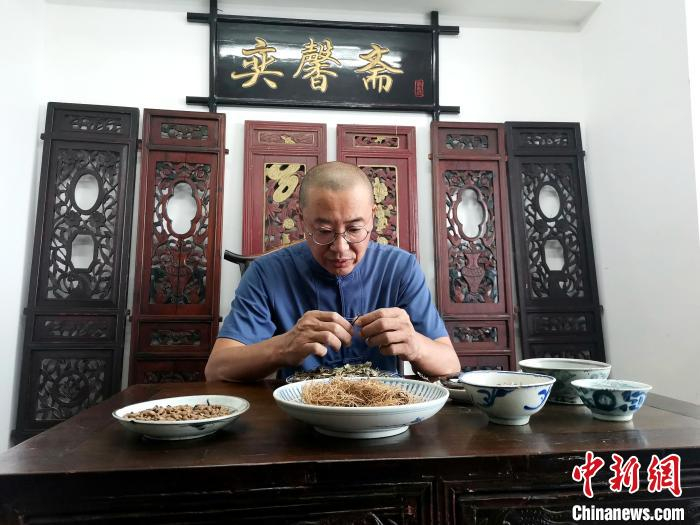 王昱家族从清朝道光年间开始制作鼻烟,到他已经是第六代。7月30日,记者在王昱的工作室内看到,工作室桌案上整齐摆放着薄荷叶、苍耳、丁香等中药材,一个个装着陈化10年以上鼻烟的密封罐整整齐齐地摆在桌案旁,王昱正一边将混合好的鼻烟原料揉碎,一边挑拣影响味道的叶梗根茎。