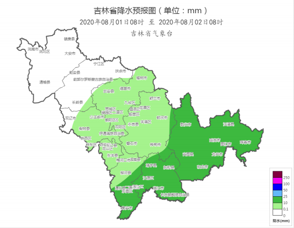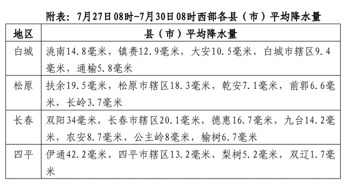 截至30日08时,全省平均降雨量19.4毫米,地区分布:辽源61.2毫米,白山39.8毫米,通化35.9毫米,长白山保护区34.6毫米,吉林19.7毫米,四平19.5毫米,长春13.7毫米,白城10.9毫米,松原10.2毫米,延边3.8毫米。