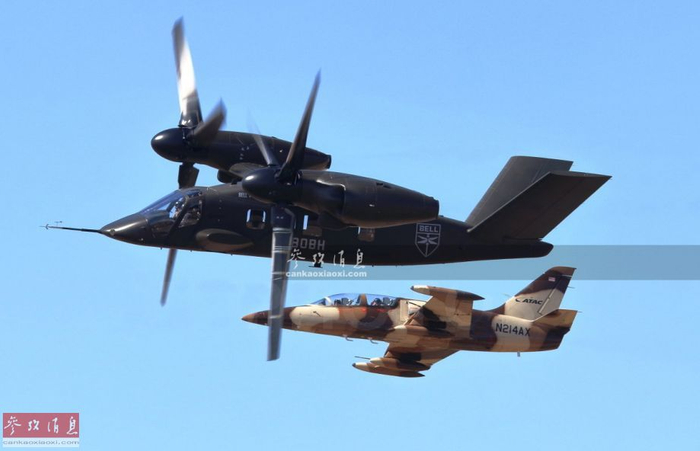 资料图片:贝尔V-280“勇士”倾转旋翼机与L-39喷气式教练机编队飞行。(美国贝尔直升机公司官网)