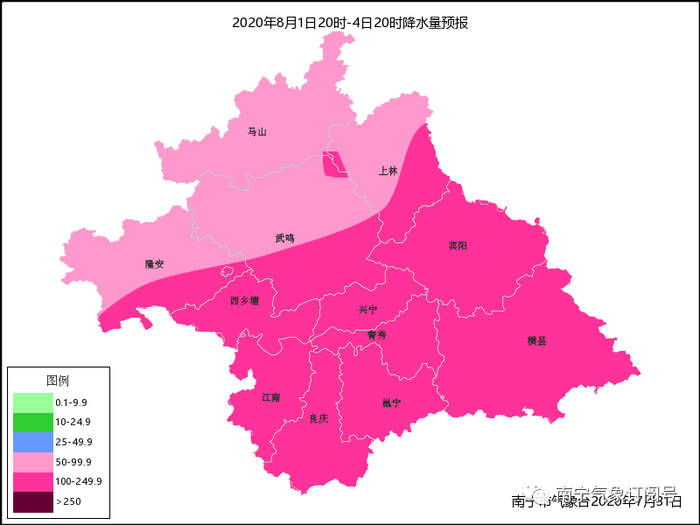 8月1日20时—4日20时南宁降水量预报图