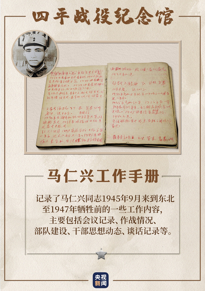 抗战胜利后,马仁兴随部队来到东北,并在辽吉战场上屡建战功。这本工作手册记录了马仁兴当时的工作情况,其中不仅有他对攻坚战术的研究心得、精心绘制的作战地图、阻击敌人的平面图,还记载了141名干部的名字、出生、文化程度、性格特点等个人情况。马仁兴常说:“干部的具体工作就是爱兵”,工作中他知人善用,为部队培养了大批优秀干部。