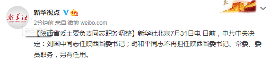 新华社北京7月31日电 日前,中共中央决定:刘国中同志任陕西省委书记;胡和平同志不再担任陕西省委书记、常委、委员职务,另有任用。