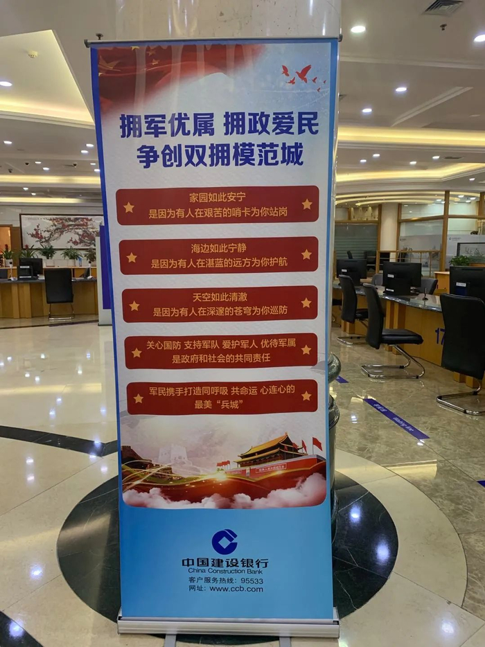 建设银行大连市分行始终保持拥军优属的光荣传统,以服务国防、服务军人为荣耀。关爱军人,优抚退役军人,做好军人和退役军人服务保障工作,努力在金融和非金融方面为大连地区的军民融合和军地共建贡献力量。