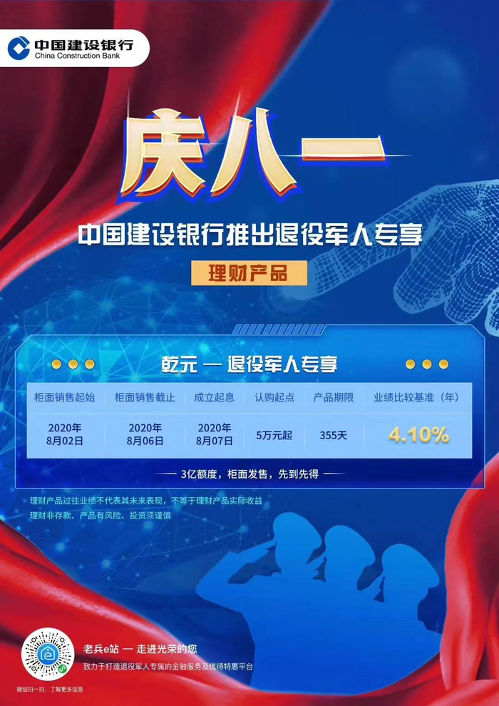 总行级专享理财产品“乾元-退役军人专享”,业绩比较基准4.1%/年,认购起点为5万元。8月2日-8月6日为柜面销售时段,预约时间:8月1日,预约方式为电话预约(各行预约电话详见底部清单),8月7日产品成立起息。