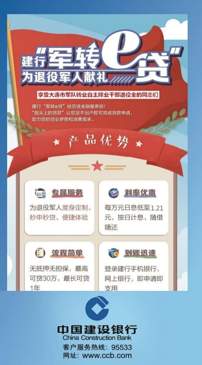 建设银行大连市分行军转E贷,为退役军人量身定制、秒申秒贷、便捷体验;每万元日息1.21元,按日计息,随借随还;无抵押、无担保,最高可贷30万元,最长可贷1年;登陆建行手机银行、网上银行即可申请。