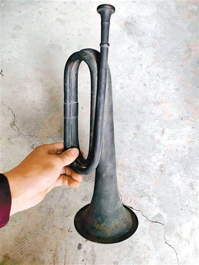 笔者曾在一旧货市场淘回一只造型古朴的军号,全长35厘米,为黄铜材质,表面被一层厚厚的黑色包浆覆盖。军号由号嘴、号身、号碗、连接箍等部分组成,外形与乐队用的小号相似,但无活塞。号身为盘绕两圈的细管体,号碗下端刻有“八路军司令部一二九师”字样。查阅史料得知,一二九师是抗日战争时期中国共产党领导的八路军三个主力师之一,辖第三八五、第三八六旅和教导团等,共1.3万余人。历经战火洗礼,军号已有多处凹凸变形,好在整体依旧保存完整,包浆浓郁,非常珍贵难得。轻轻吹奏,号声激扬,让人不禁振奋精神,一种豪情油然而生。