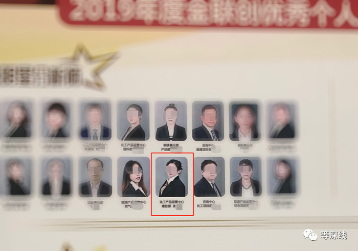 记者在该公司发现,走道墙壁上张贴着“光荣榜”,对2019年度优秀个人和团队作表彰。在16名“明星分析师”中,有张某的名字和相片。她所属部门为“化工产品运营中心橡胶部”。