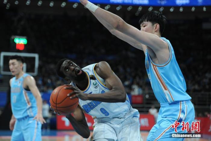 资料图:北京时间12月25日,CBA圣诞大战打响,北京队主场迎战新疆队。最终新疆队以88-87险胜北京队,图为周琦(右)在防守中。中新网记者 李骏 摄