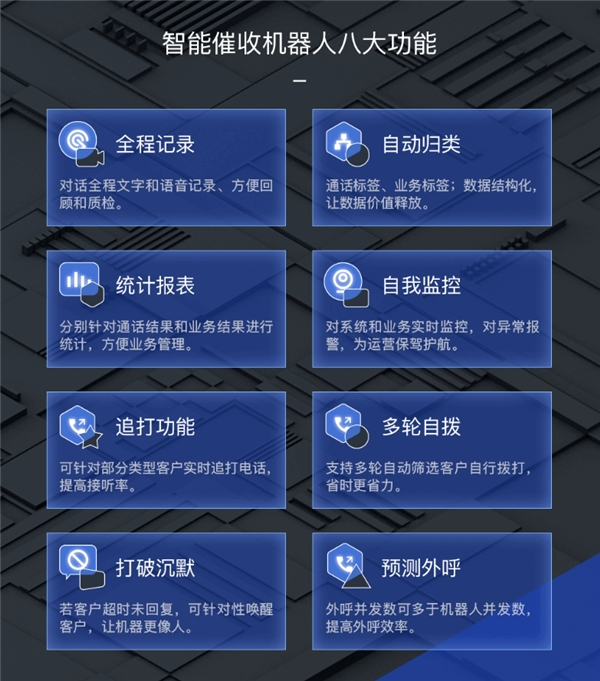 在实际使用中,如线路可以支持,2000余位客户,机器人仅需用时几十分钟就能完成全部外呼工作。而同样的工作量如果通过人工外呼,则需要20名工作人员才能完成。并且,机器人还可对未接通的电话进行再次呼叫,重复提醒。据统计,机器人催收的客户还款率较人工催收提升了约20%。