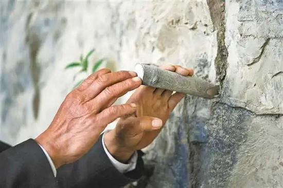 这些打进岩缝里的木桩,就是当年修路村民挂东西、固定帐篷用的。
