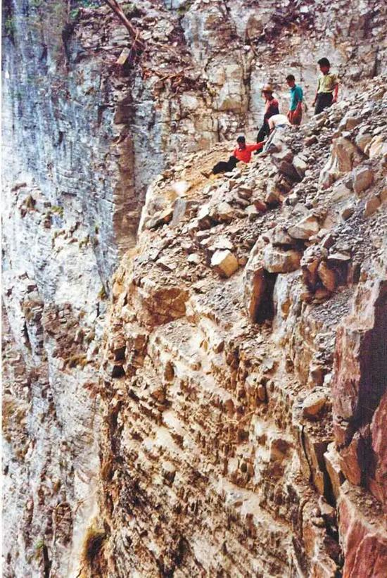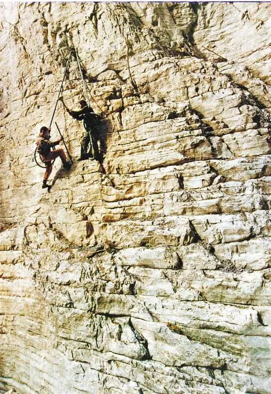 这条路,远比想象得更难修。四周都是陡峭岩壁,连落脚之地都很难找,更别说在上面施工了。但下庄人并没被困难吓倒。几个年富力强的年轻人,腰上系一根长绳,徒手爬上悬崖,悬在半空钻炮眼。他们安装并点燃炸药,然后把身体紧紧地贴在崖壁上,以防被飞石击中。