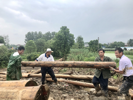 7月28日,同大圩南闸村段,当地村民在搬运用来加固圩堤的水杉木。