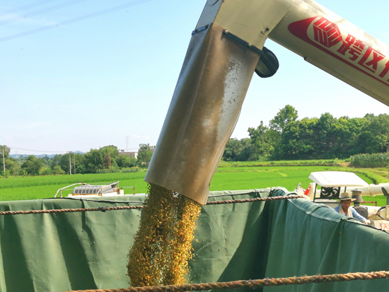 7月31日,安徽省合肥市庐江县金桥村,收割机正在卸谷。受强降雨和洪涝灾害影响,今年金桥村早稻收成较往年减少了近三成。