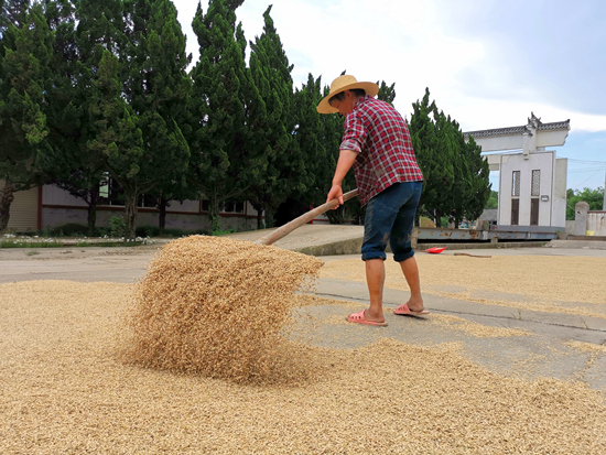 7月31日,安徽省合肥市庐江县浮槐村,一名村民在翻晒稻谷。