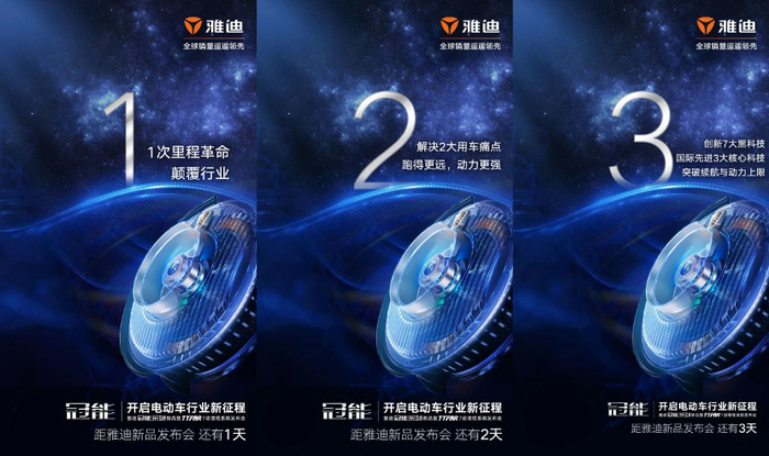 近日,电动车行业领导品牌——雅迪连续三天发布了三张倒计时海报,官宣将在8月4日晚19点30分举行新品发布会,消费者可前往微盟、快手、天猫、京东、拼多多、微博、bilibili、小红书等多个平台的雅迪官方直播间收看直播。