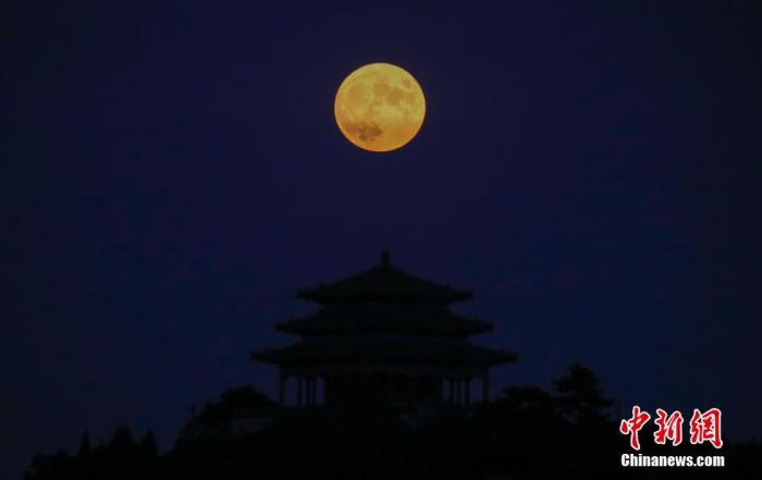 资料图:8月3日,在北京北海公园拍摄的月亮升起。据悉,2020年庚子鼠年的农历六月里,十五的月亮“十四圆”,最圆时刻出现在8月3日23时59分。天文专家介绍,“十五的月亮十四圆”现象比较罕见,21世纪中仅会出现6次。 中新社记者 杜洋 摄