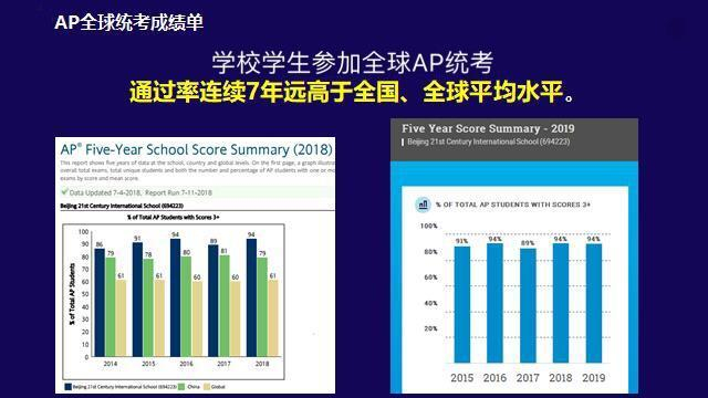 AP是由美国大学理事会(College Board)组织的美国大学先修课程,优异的AP成绩不仅能让申请者在全球竞争中脱颖而出,还能帮助学生在大学折抵学分。作为美国大学理事会授权学校,二十一世纪国际学校学生参加全球AP统考,通过率连续7年远高于全国、全球水平。截至2019年8月,高中部共有194名学生获得"AP学者",110名获得"AP荣誉学者",151名获得"AP杰出学者"称号。其中,不乏以AP8门以上5分(最高分)的卓越成绩被芝加哥大学、加州大学洛杉矶分校、加州大学伯克利分校等顶级名校录取的优秀学生。