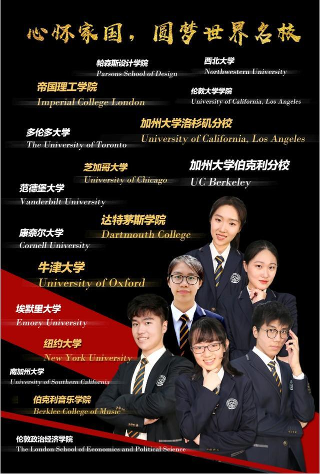 2020届毕业生乘风破浪,星光璀璨。乐嘉怡同学不懈挑战自我,摘获托福119分战果,成功"爬藤"美国达特茅斯学院;在高中时就获得全额奖学金的王茗艳同学一路"学霸",被美国芝加哥大学录取,并获大学本科每年7万多美元的巨额助学金;王浩程同学以8门AP最高分、金子越同学以9门AP最高分的优异成绩分别斩获加州系大学最耀眼的两颗"明星"加州大学伯克利分校、加州大学洛杉矶分校的录取;惠俊皓同学潜心钻研科学,圆梦美国范德堡大学化学专业;校辩论队队长倪杉同学舌辩国内、国际赛场,被英国G5超级精英大学伦敦政治经济学院国际关系专业录取……