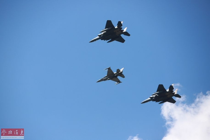 波兰空军F-16战机与美国空军F-15E战斗轰炸机组成联合编队低空通场。