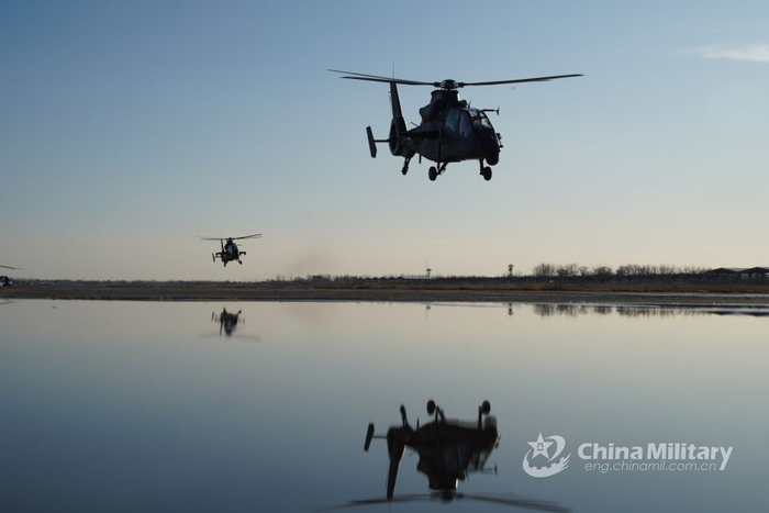 直-19低空掠过水塘,水面可见武直倒影。(图片来源:中国军网)