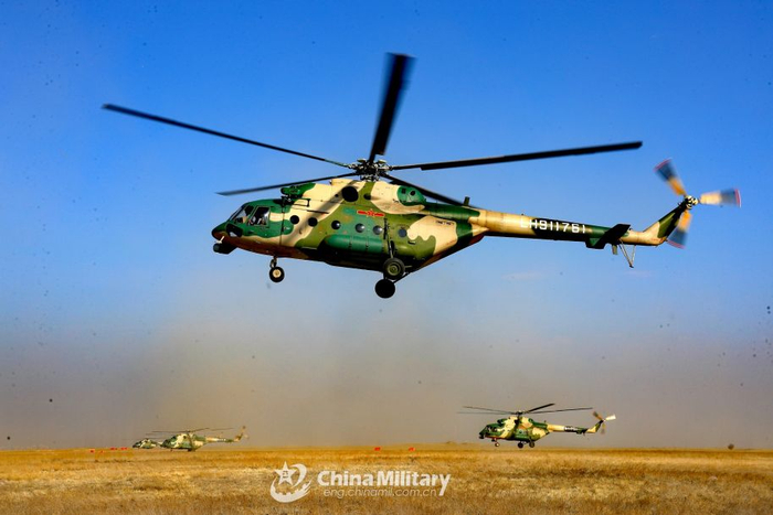 运输直升机群出动训练瞬间。(图片来源:中国军网)