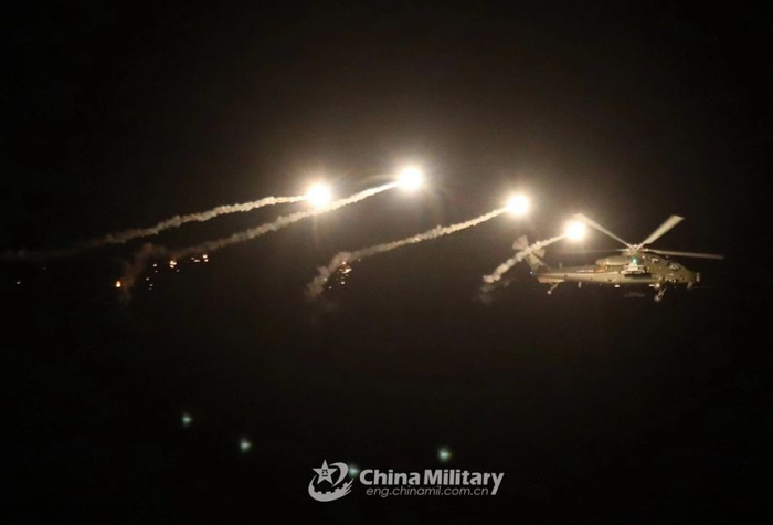 武直夜间释放热焰弹,干扰敌军红外探测。(图片来源:中国军网)