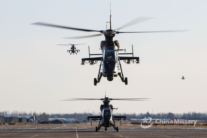 据中国军网报道,12月17日,隶属于第81集团军下辖某陆航旅的直-19武直部队举行超低空突袭演练。图为直-19机群依次起飞。(图片来源:中国军网)