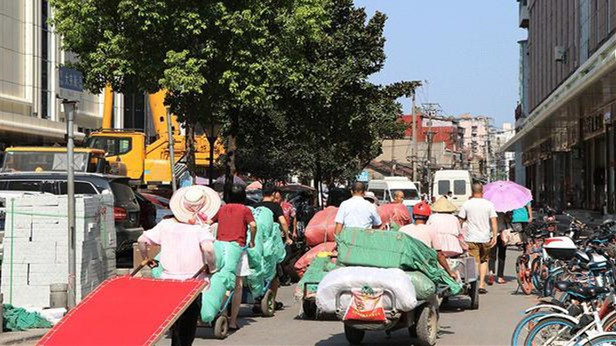 8月4日中午1时许,第一财经记者来到汉正街市场,尽管室外的温度高达40℃,但这里依旧车水马龙、人头攒动,货车、板车、小推车穿梭不停。