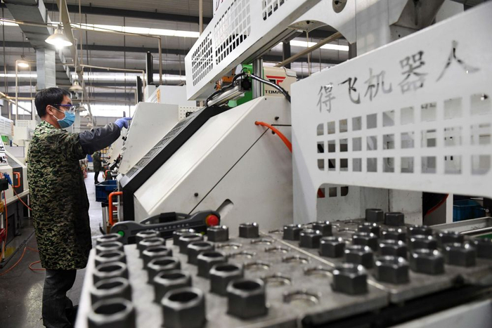 3月5日,在江西省宜春市一家企业车间内,工人在半自动化生产线上工作。各地工业企业在做好疫情防控的同时积极复工复产。新华社发(周亮 摄)