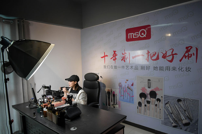 5月15日,在江西省南昌市青山湖区一家电商企业的直播间内,主播线上直播销售化妆刷。新华社记者 彭昭之 摄