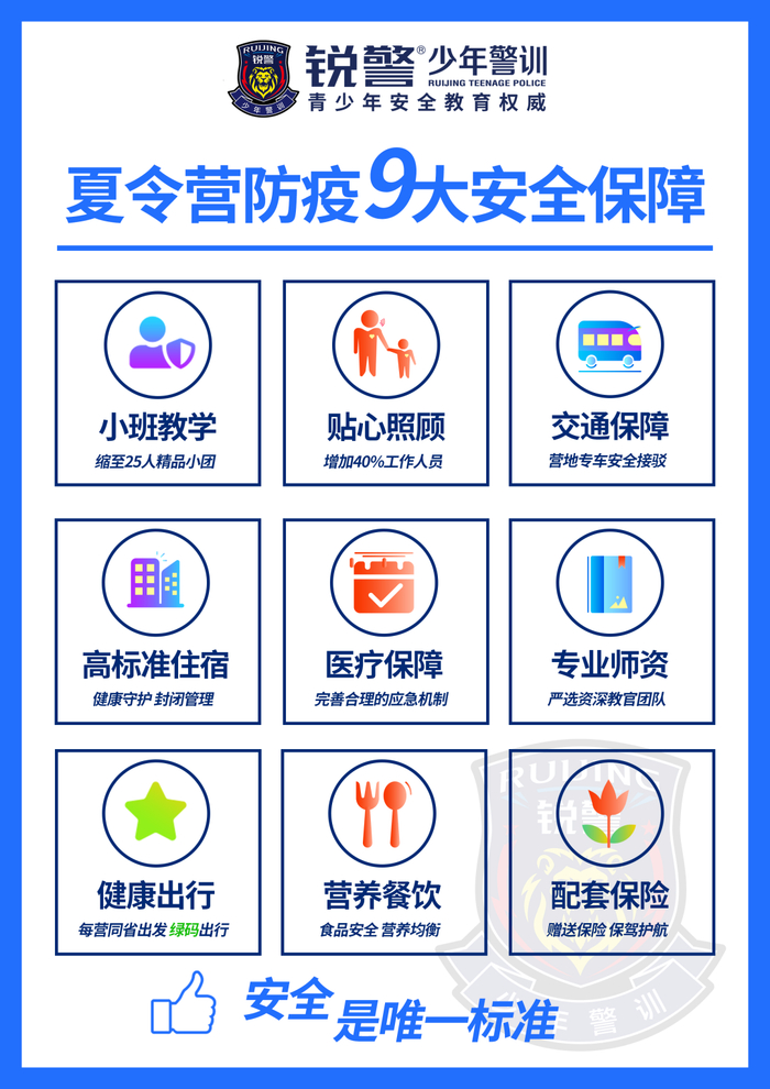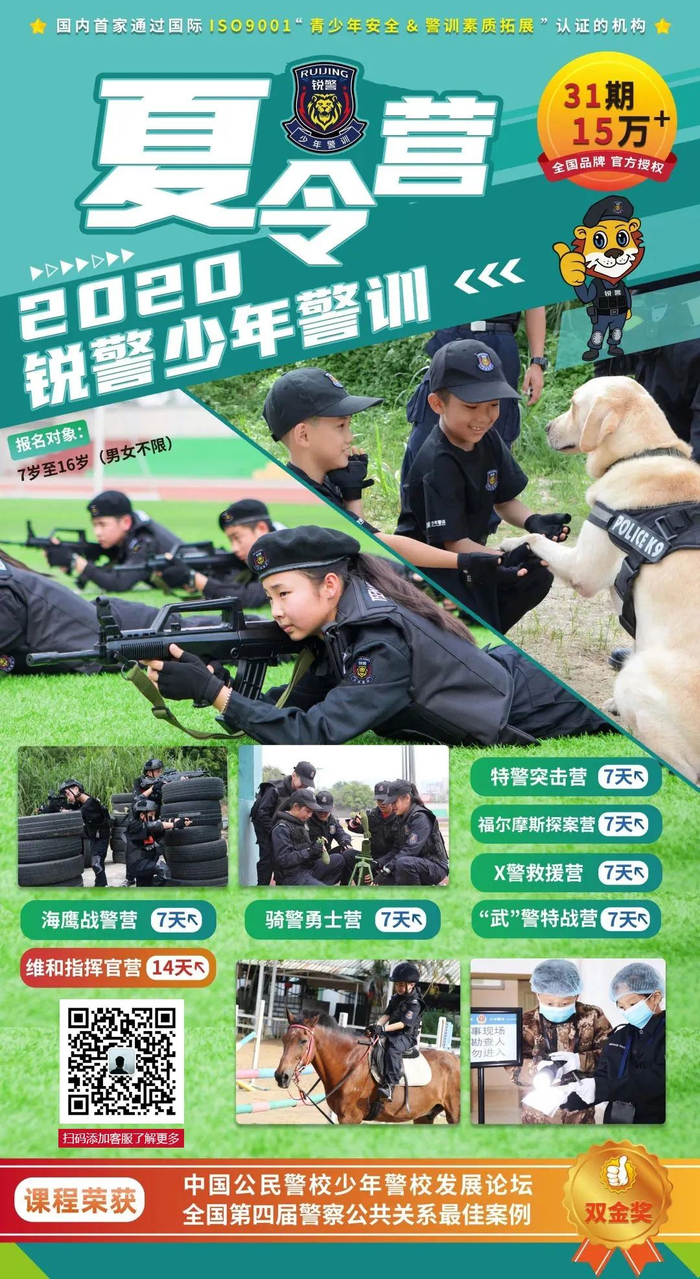 锐警少年警训是国内首家通过国际ISO9001“青少年安全&警训素质拓展”双认证的项目,联合广东警官学院、中国人民公安大学等国内知名公安院校及各地公安机关建立战略合作关系,有专业警务教学资源、强大的安全教育师资队伍,针对成长期青少年(7-16岁)成长特点、学业发展需要,特别开发的一整套针对性强、体验度佳、收获度高的夏令营,31期15万+警训队员见证成长!