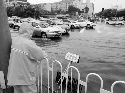 谢师傅说,他自己是凌晨3点下夜班回到家,刚休息了几个小时就接到电话赶到太榆路学府街口的。刚赶到的时候,路面上的水已经漫过了路牙子,他就第一时间把路边的排水渠盖打开了,同时在排水渠附近立了“紧急排水”的警示牌,提示大家注意绕行。“你看现在水比路牙低了一些,我刚来的时候水跟路牙子一样高呢。”谢师傅说,那是因为10点左右雨稍微小了一点儿,水就下去了一些。但11点左右,雨又下大了,路口水位比之前又高了一些。虽然看起来积水的深度基本不变,但谢师傅还要留在原地观察路况。