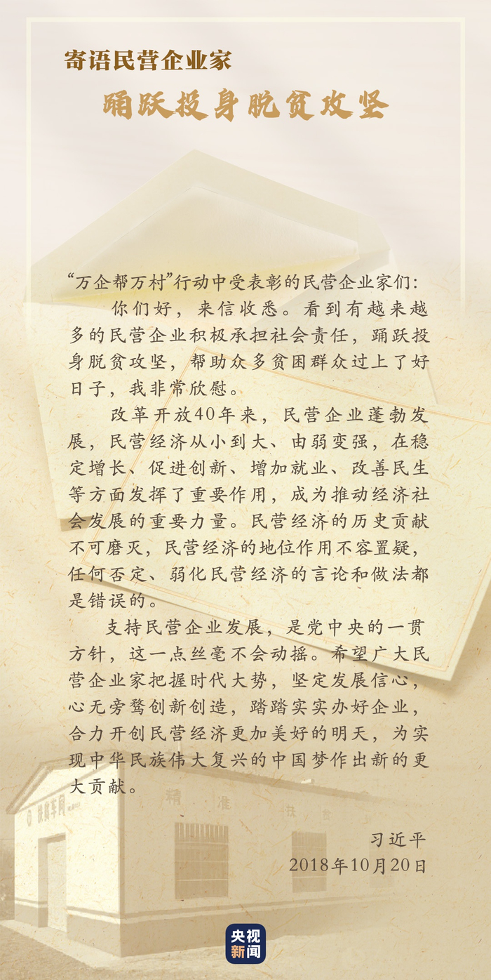 习近平对民营企业高度重视,给“万企帮万村”行动中受表彰的民营企业家回信,对他们踊跃投身脱贫攻坚予以肯定,勉励广大民营企业家坚定发展信心,踏踏实实办好企业。