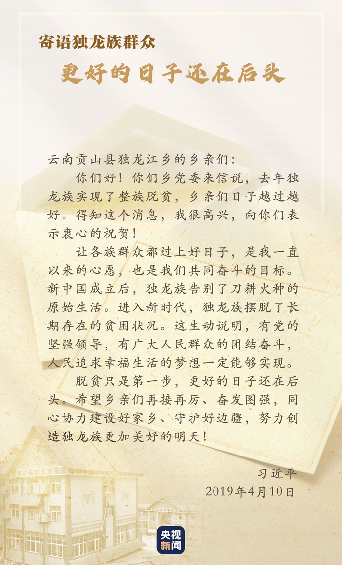 2018年,独龙江乡6个行政村整体脱贫,独龙族实现整族脱贫,基础设施、特色产业、社会事业等都发生了巨大变化。贡山县干部群众再次给习近平写信汇报脱贫成绩,习近平得知后非常高兴,向他们表示“衷心的祝贺”,并勉励乡亲们为过上更加幸福美好的生活继续团结奋斗。