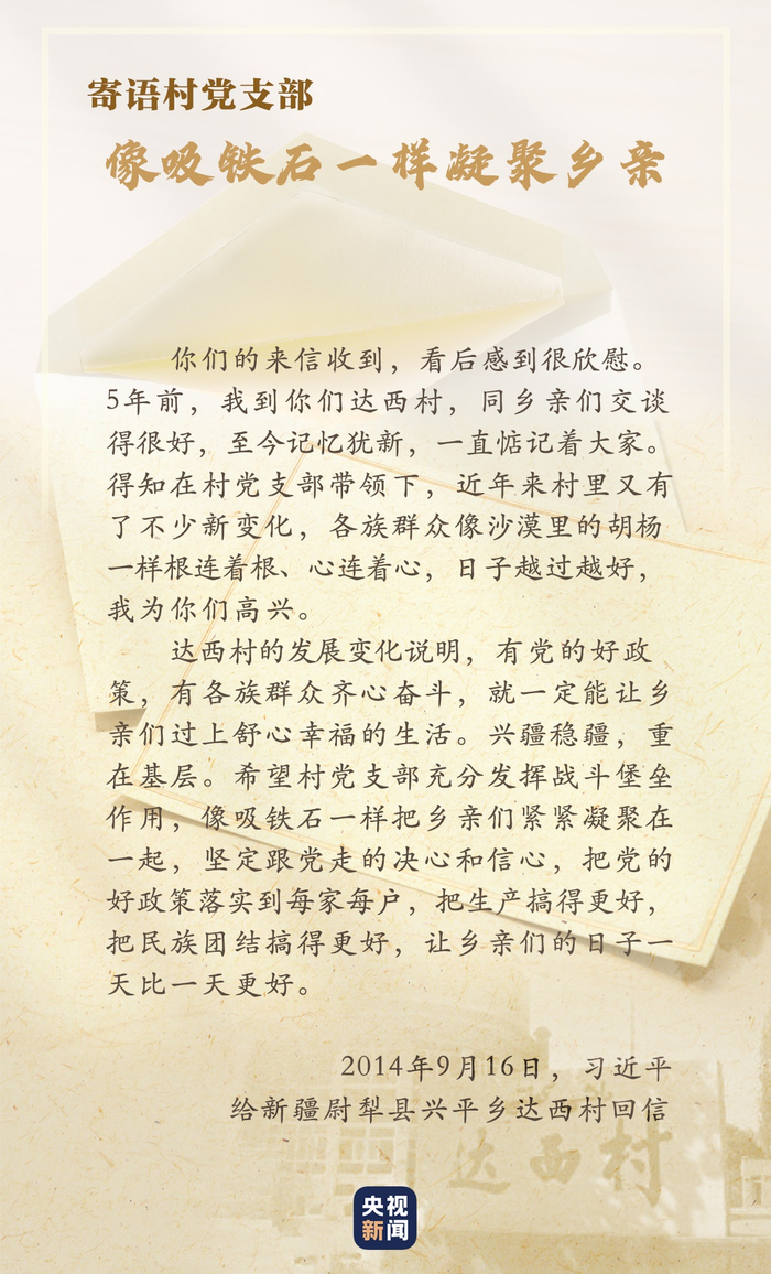 “口袋里要鼓囊囊,精神上要亮堂堂”。2014年4月,习近平在新疆考察时讲到了达西村的村训。村民们怀着激动的心情给总书记写信,汇报这些年村里的积极变化。当年9月,习近平总书记给沙吾尔·芒力克和全体村民回信,强调兴疆稳疆,重在基层。