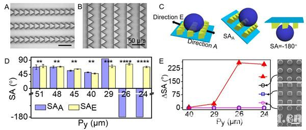 图2:(A)“首尾相连”TMAS,(B)“肩并肩”TMAS,(C)滚动方向及滚动角定义(SA),(D)y方向上,SAA和SAE随阵列周期(Py)的变化规律,(E)不同形状微柱设计的各向异性度ΔSA随Py的变化规律。